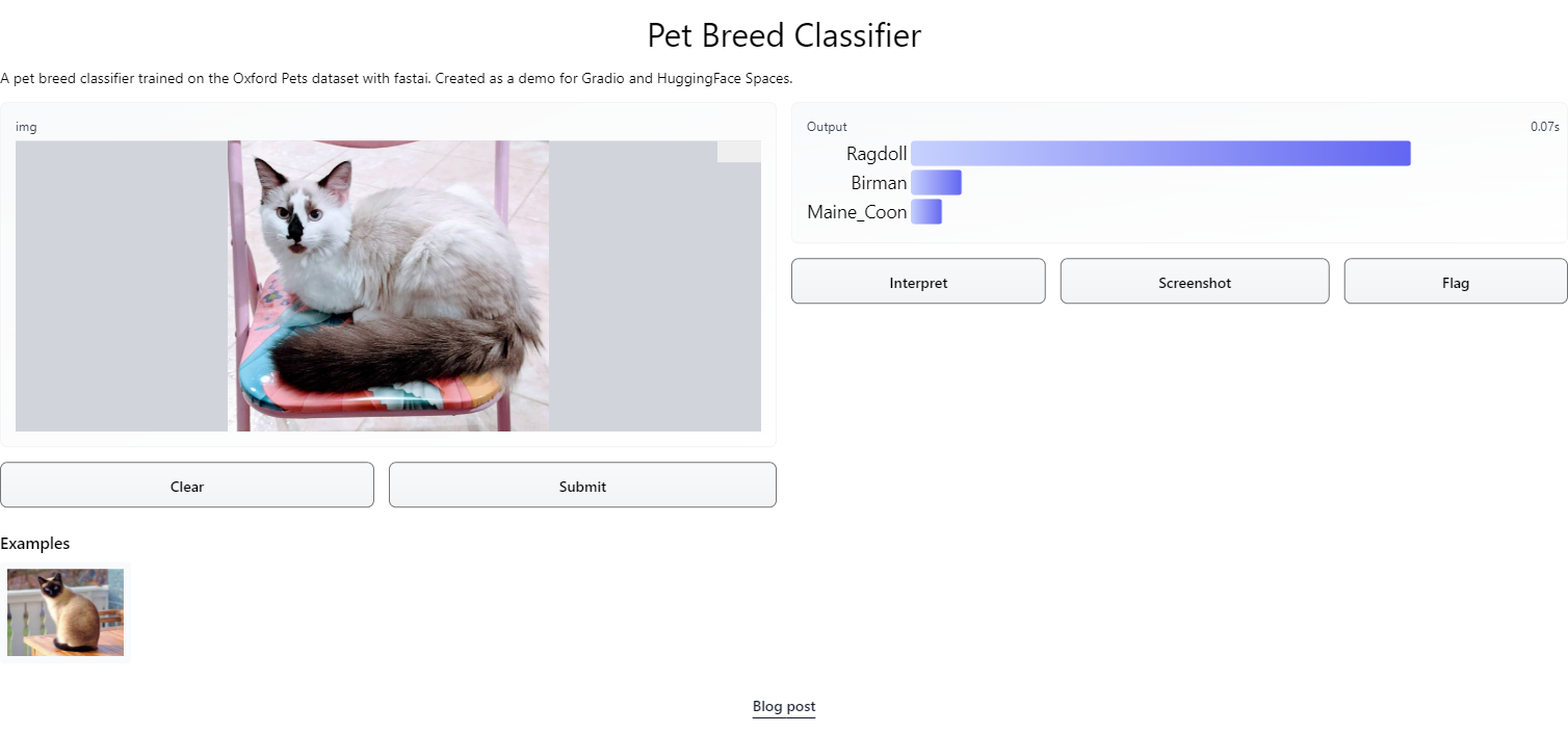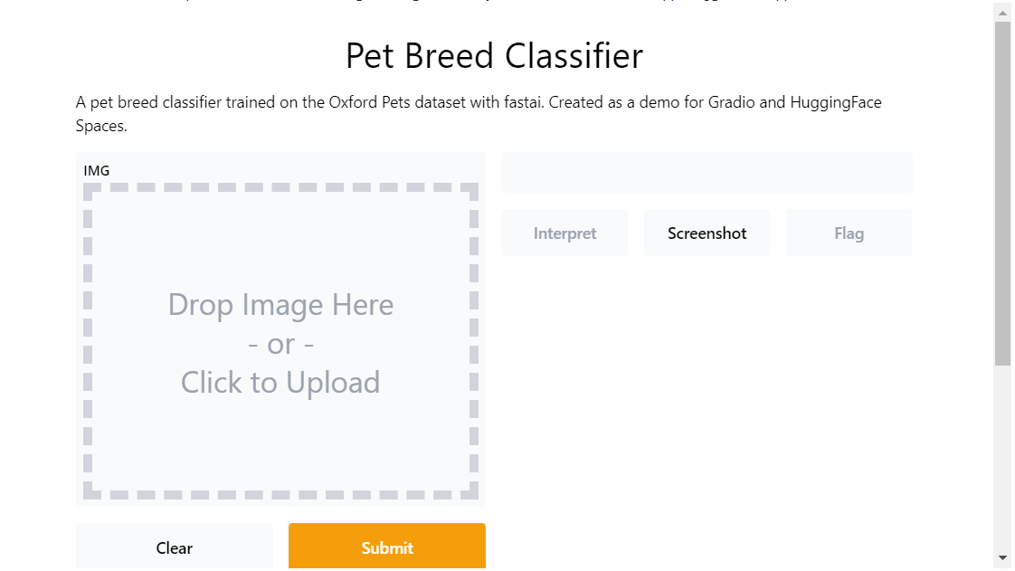 That’s it! In a few minutes, you trained a pet classifier model with fastai, made a demo interface with Gradio, and hosted it for free on a HuggingFace Space! You can try it out right below or you can try it out on HuggingFace Spaces here. All the files described in this post located here). {% fn 2 %}